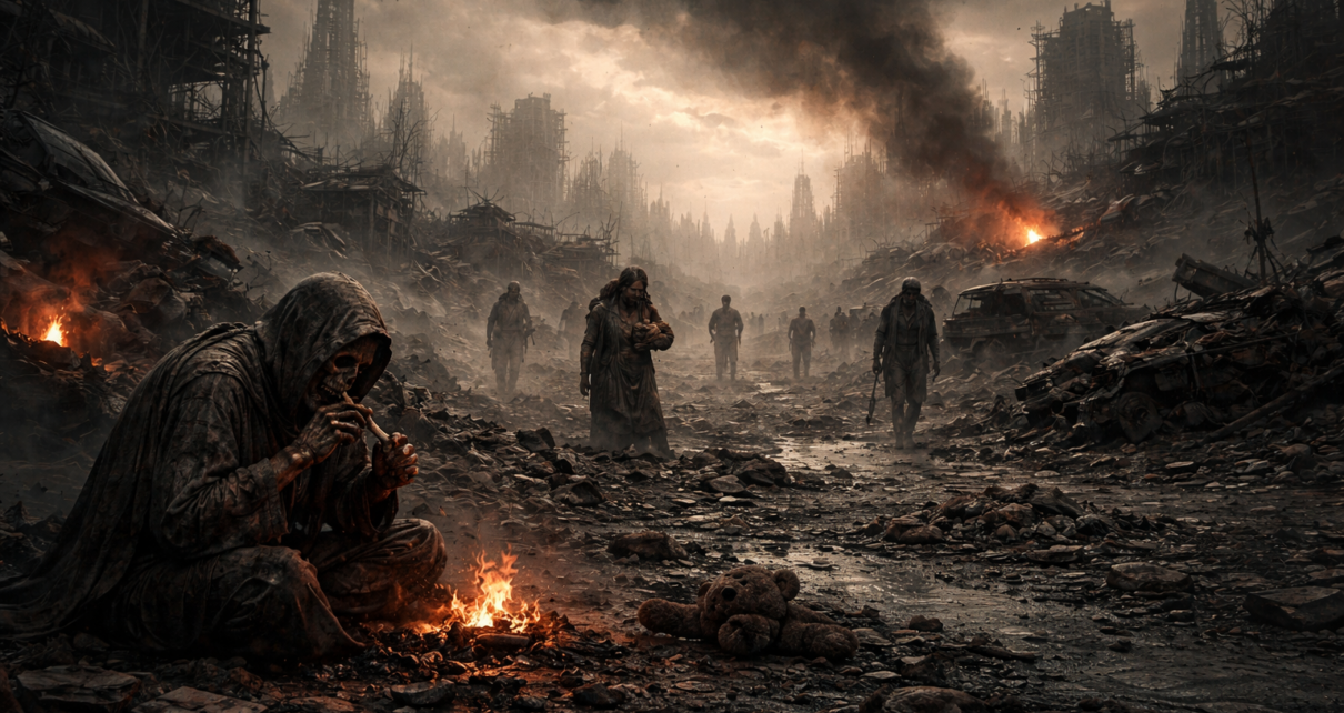 In that dark tranquility, what remained of humanity moved like shadows that had forgotten their owners. A blind old man wandered slowly through the silent ruins, his feet dragging across the ash and broken glass, without any sign of pain or understanding. His dead eyes, pale and useless, stared into nothing, yet his hand reached out from time to time feeling for walls that were no longer there, for doorways that had long since collapsed into dust. Not far off, a bereft mother with no child left to care for lay curled upon the hardened earth, her breathing so faint it scarcely disturbed the gray powder that was settling mutely upon her parched lips. She did not weep. She did not call out. She simply closed her eyes, as though sleep might succeed where life had failed her. Others drifted in the distance. Thin figures wrapped in rags, moving without urgency, without direction, without even the pretense of hope. No one spoke. No one called another’s name. They passed one another like ghosts already acquainted with the mute devil, each quietly surrendering to him in their own time. They subsided, as if the world had not ended in violence at all, but had instead simply grown tired of them, and gently, indifferently, let them fade away into the reckoning night of day.